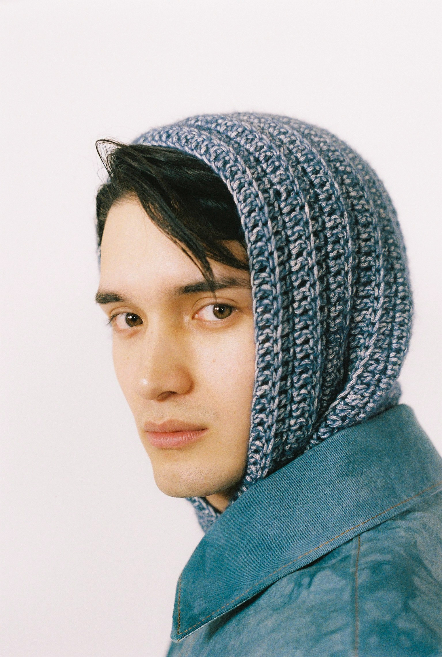 Editorial photos of a collaboration between Bobon and Easy the Bucket that redefines craftsmanship. Crochet merged with denim-inspired textures.